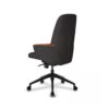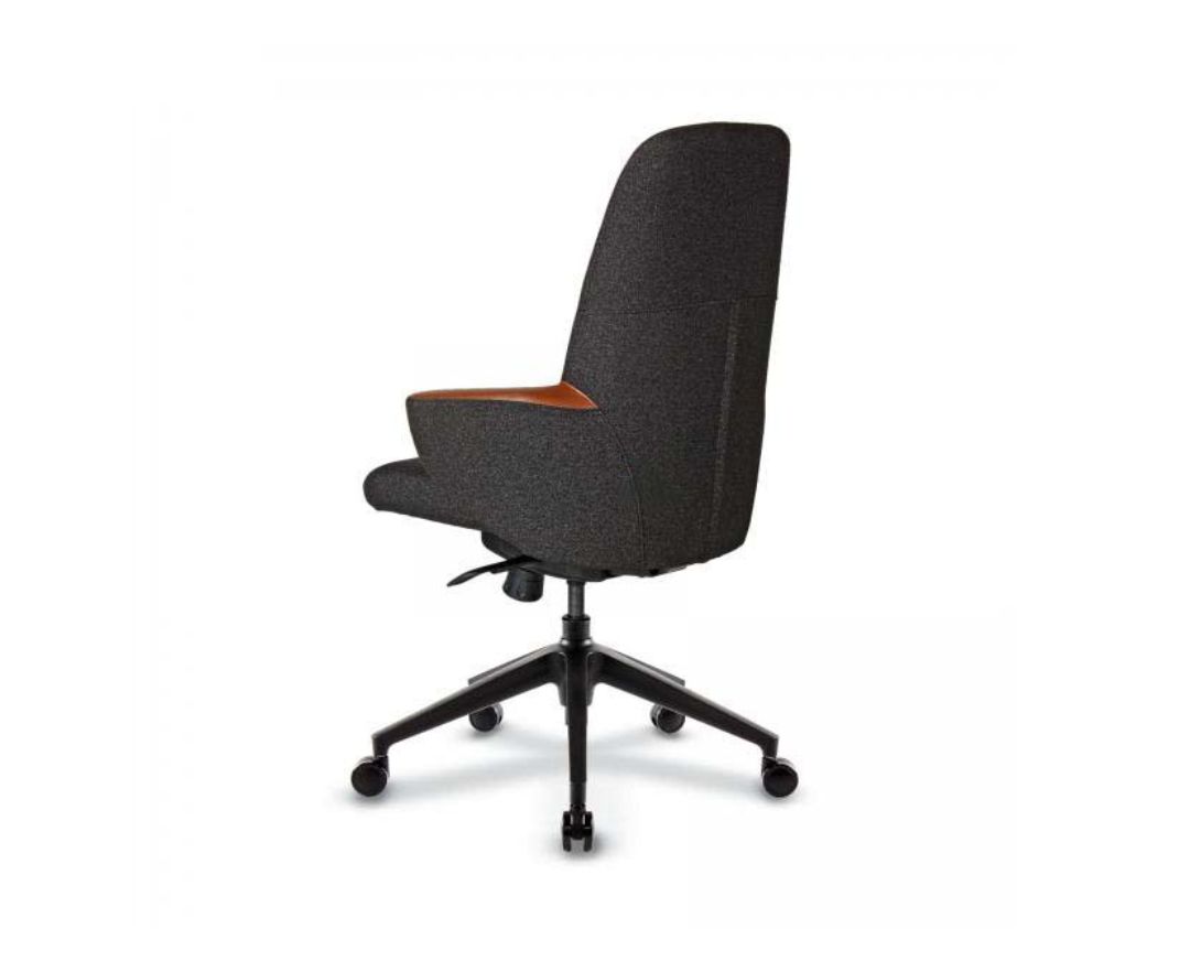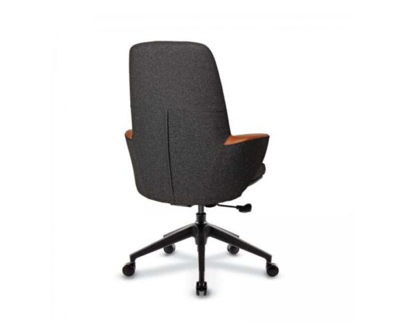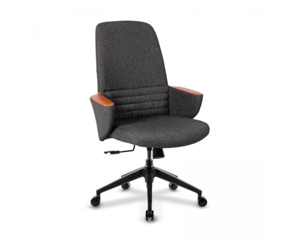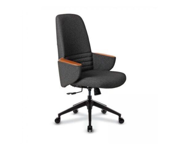 Visoka radna kancelarijska stolica,modernog dizajna, sa multitilt mehanizom- više pozicija zaključavanja, liftomatom- stolica je podesiva po visini i petokrakom nailonskom bazom sa točkićima. Stolica je istapacirna u štofu, dok je top rukonaslona istapaciran u ekokoži, svetlo braon dekora, što predstavalja poseban ukras i stolici daje elegantnu liniju.
