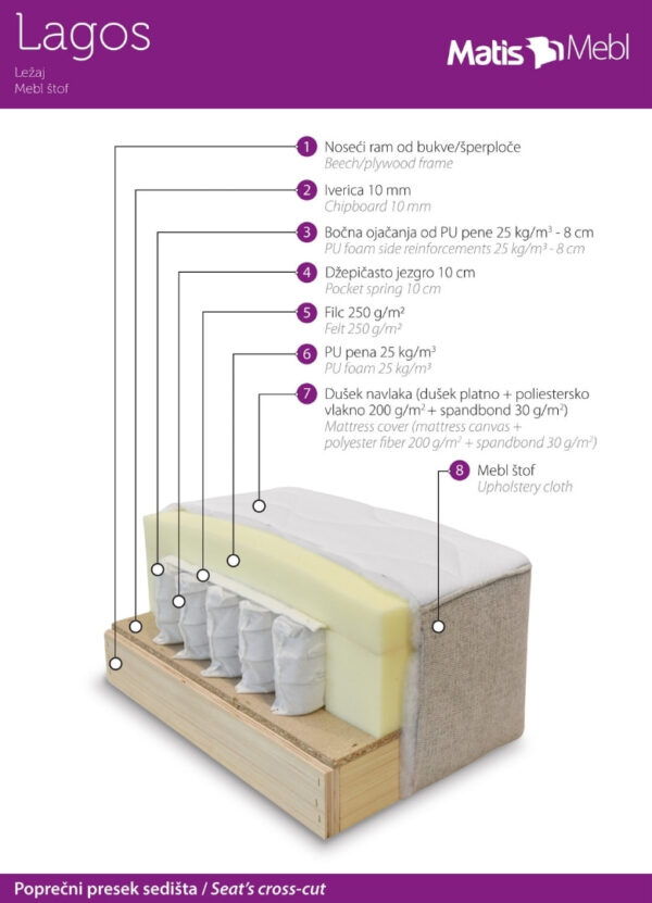 Ležaj Lagos je jedinstven proizvod na tržištu prvenstveno po svojoj funkcionalnosti. U ležaj Lagos je u sedalne delove i celokupnu površinu za spavanje ugrađeno kvalitetno džepičasto jezgro što ga čini veoma udobnim kako za sedenje tako i za spavanje. Prilikom tranformacije ležaja u ležaj za spavanje rasklapanjem sedalnog dela dobija se prostor za spavanje koji je presvučen platnom za dušeke. Zahvaljujući kombinaciji džepičastog jezgra, polieranske pene, poliesterskog vlakna specifične težine 200 g/m2 i dušek platna spavanje na ležaju Lagos može da parira spavanju na bilo kom krevetu sa dušekom.